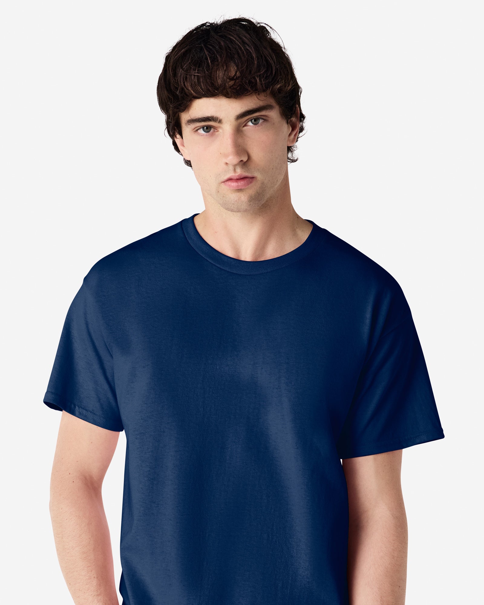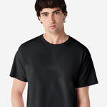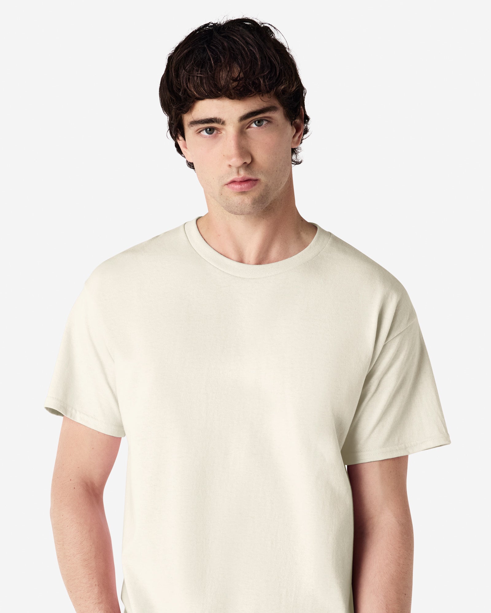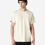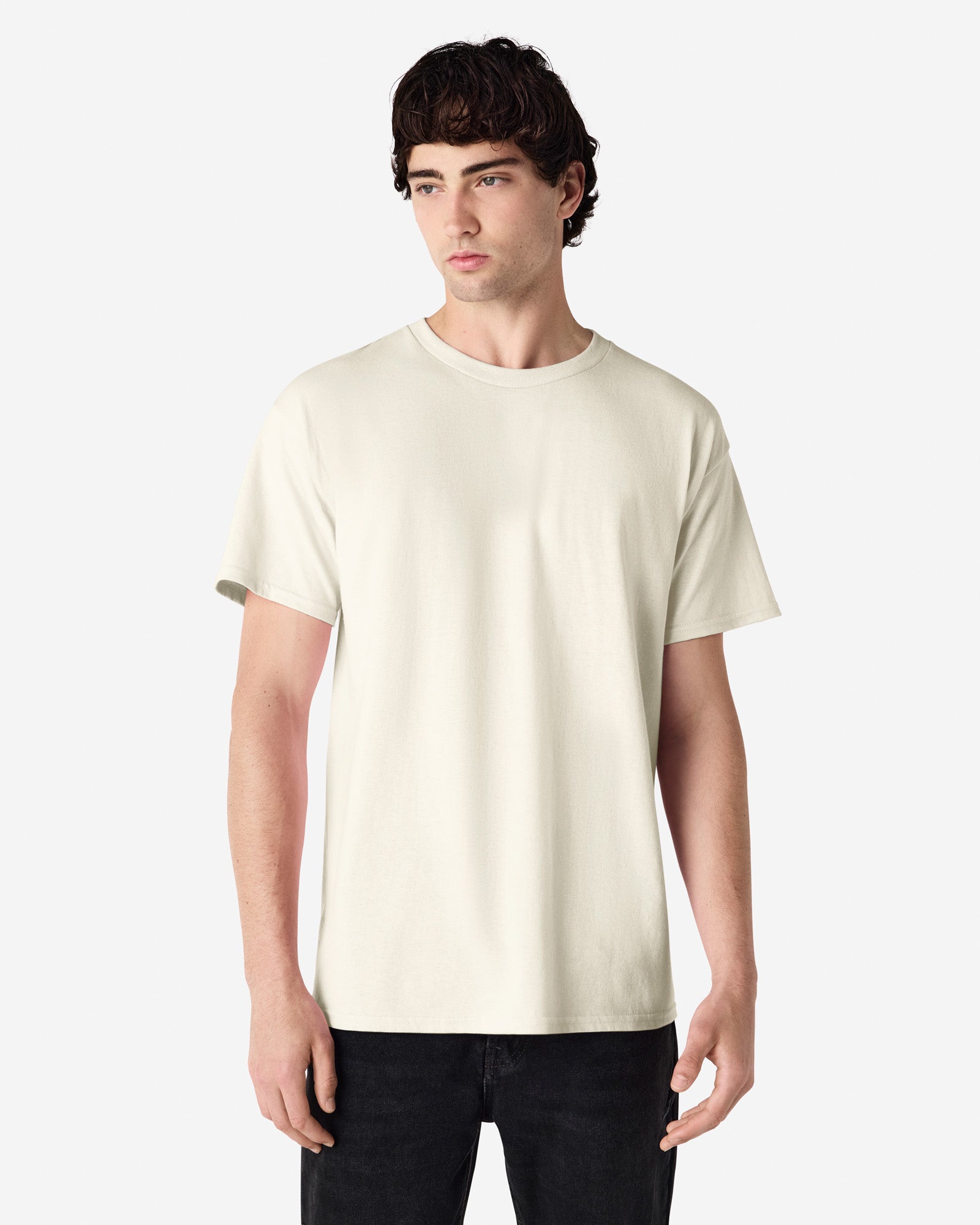 Non-topstitched classic width rib collar, Classic fit, tubular body, Taped neck and shoulders, Double-needle sleeve and bottom hems, Tear away label