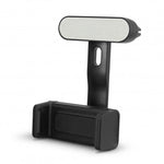 Stylish spring-loaded car phone holder which has a very prominent branding area. It has a soft rubber clip which pushes onto car air vents and securely holds a phone so it can be seen by the driver and used as a GPS.