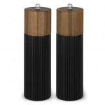 Elevate your dining experience with the Keepsake Noir Salt and Pepper Grinders. Made from acacia wood, the top has a natural wood grain finish while the body features a contrasting black paint finish with ribbed design. A grind adjustment button ensures t
